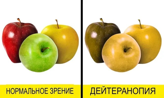 Дейтеранопия — это форма цветовой слепоты, при которой человек не может различать зеленые оттенки. Это связано с дефицитом одного из типов фоторецепторов в сетчатке глаза — колбочек, которые отвечают за восприятие зелёного спектра.